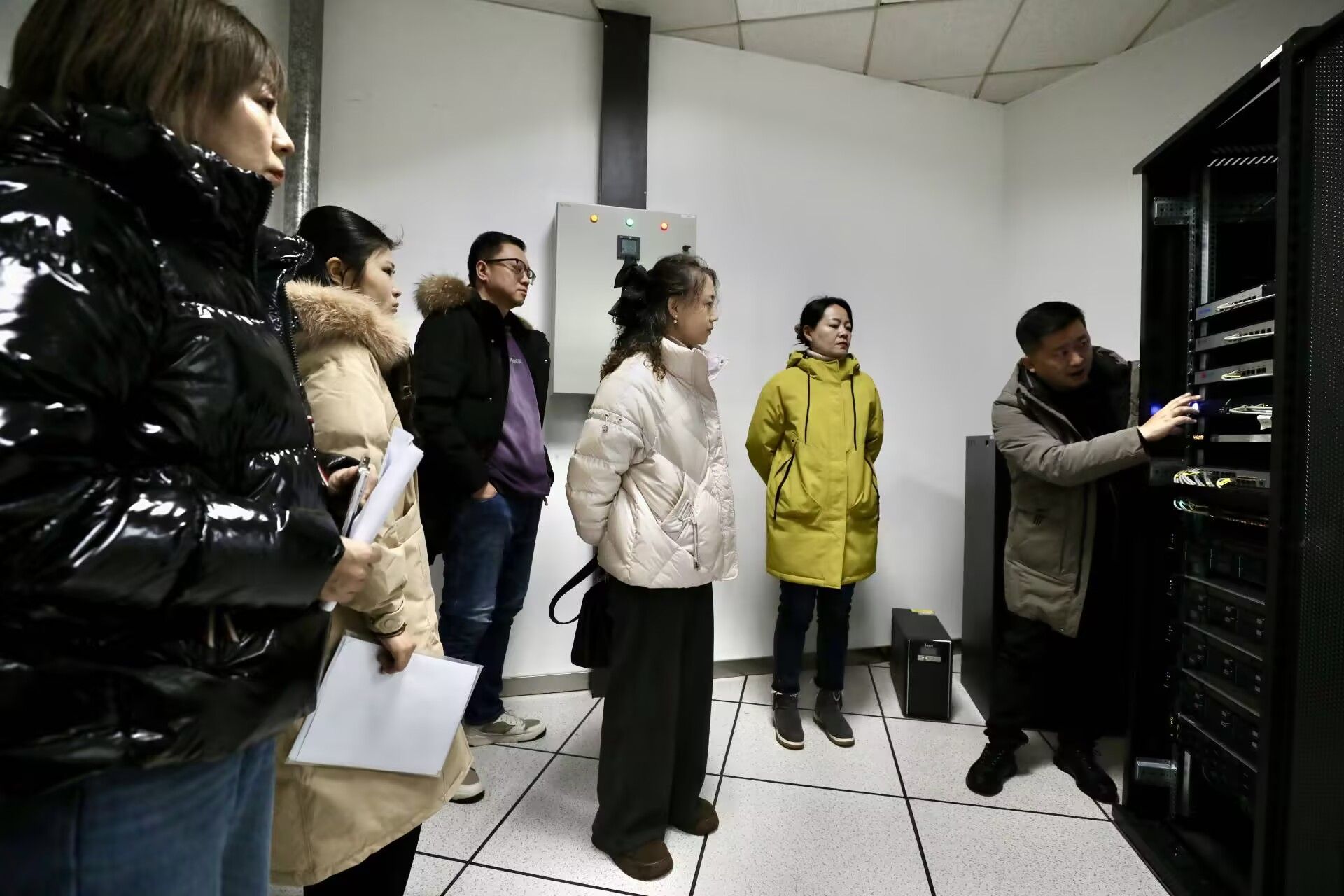 调研中,参观了我校校史馆,走访了我校档案信息化建设机房、档案库房等关键场所。在档案信息化机房,我校详细介绍了电子档案管理系统的架构设计、功能模块及运行机制,现场演示了系统在档案采集、著录、归档、查询等全流程中的应用操作,实现“建档-管理-查询”高效运作;在档案库房,考察了库房内的动环监控系统与恒温恒湿设备,我校详细介绍了设备在实时监测库房温度、湿度、空气质量、安防状态等方面的作用,以及如何通过智能化调控确保档案实体的长期安全保存。同时,档案馆副馆长郭淼从档案资源建设、队伍建设、制度建设、信息化发展等方面全面介绍了我校档案工作的整体情况,重点分享了我校在电子档案转化工作中积累的经验与遇到的问题,包括传统载体档案数字化扫描的标准规范、电子档案的长期保存技术、与其他业务系统的数据对接等内容。